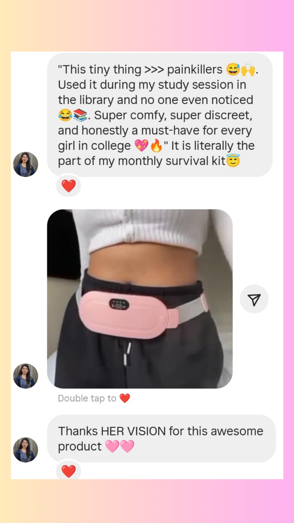 The belt uses gentle heat and light vibration to provide comforting warmth around the lower abdomen, helping you feel more relaxed and at ease during your period.